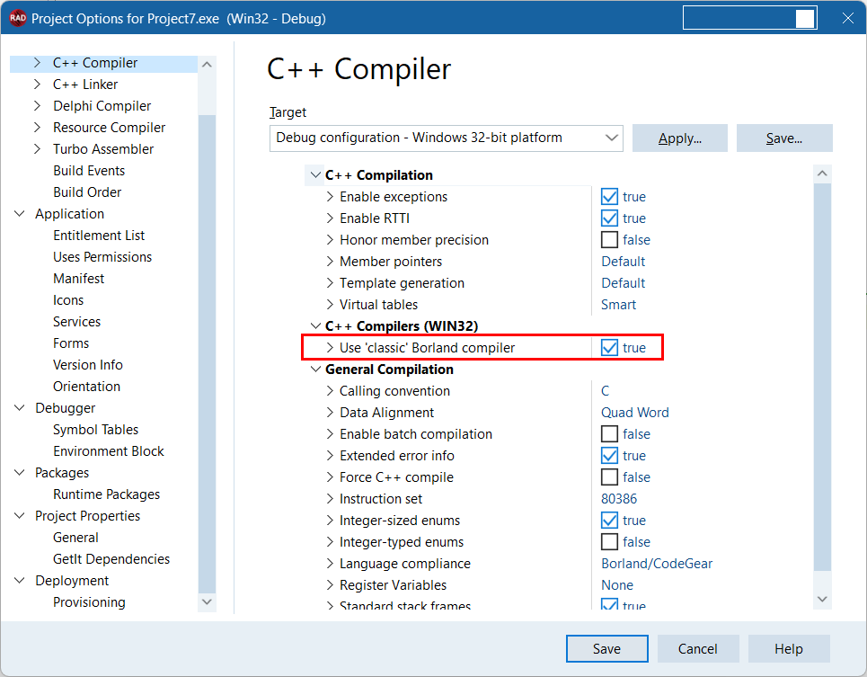 Can you please try setting the Use 'classic' Borland compiler option to true in the Project options>C++ Compiler?