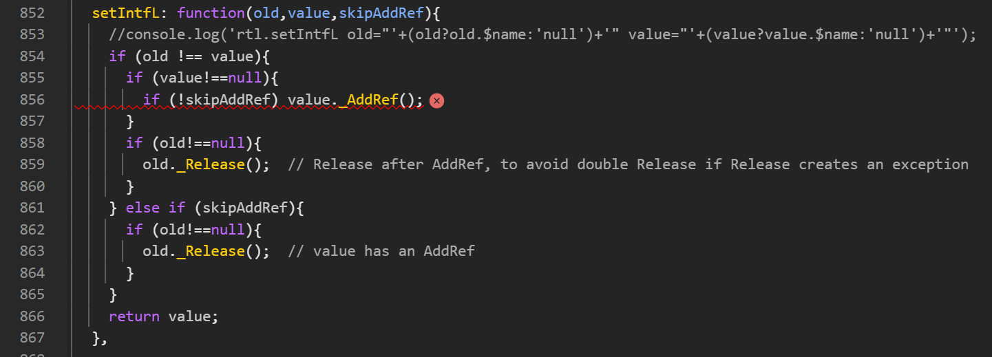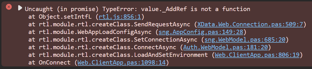Although I can also not directly see a relationship to an issue with _AddRef() calls, we did this week a fix in rtl.js you might test with to see if it helps. rtl.zip (11.8 KB)