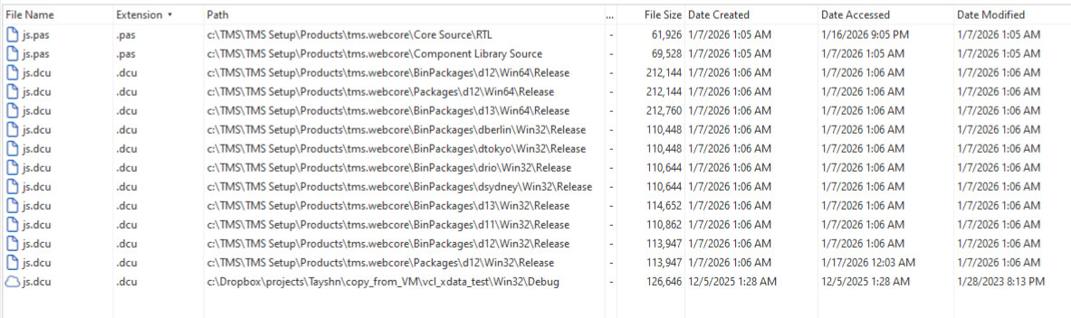 Then also scan your full hard disk for all copies of JS.DCU and make sure there is only ONE copy and it is the copy that belongs to the latest version of the registered install and when multiple copies are found, delete ALL copies that are not part of the latest TMS WEB Core registered version install.