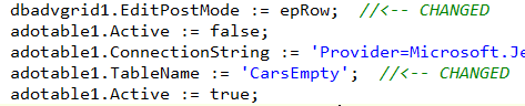 adotable1.TableName := 'CarsEmpty'; //<-- CHANGED