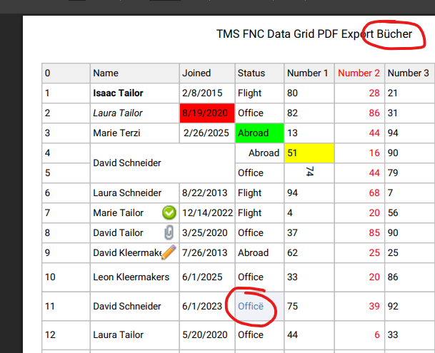 We use TMS Web Core 2.9.6 and FNC UI Pack 7.0. If we do an PDF export for a FNC data grid with more than one page and the header string assigned to TTMSFNCDataGridPDFIO.Options header contains german umlauts like ä, Ä, ö, Ö, ü or Ü, then the header in the PDF is only correct displayed on the last page. On the first pages the header is somehow encrypted. Depending on this string it is also possible that even no PDF is displayed on calling the Save method of TTMSFNCDataGridPDFIO.