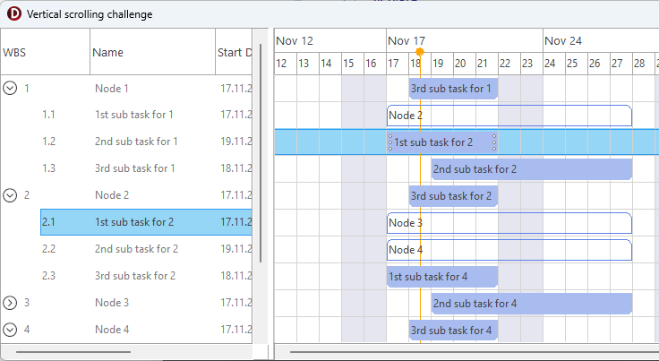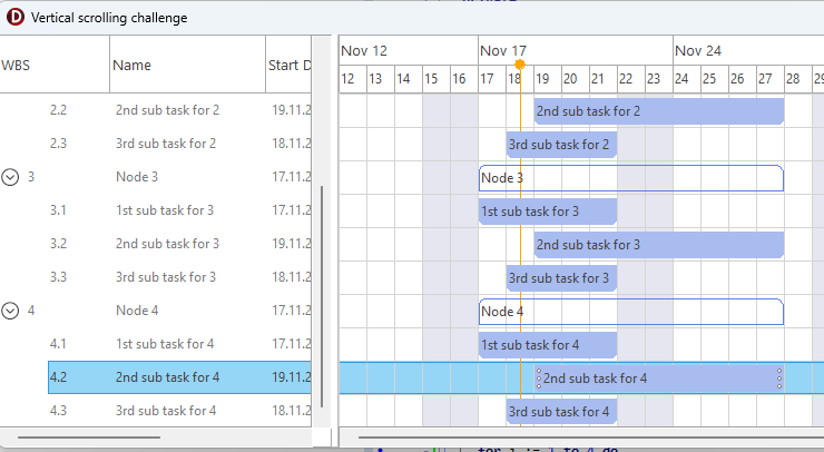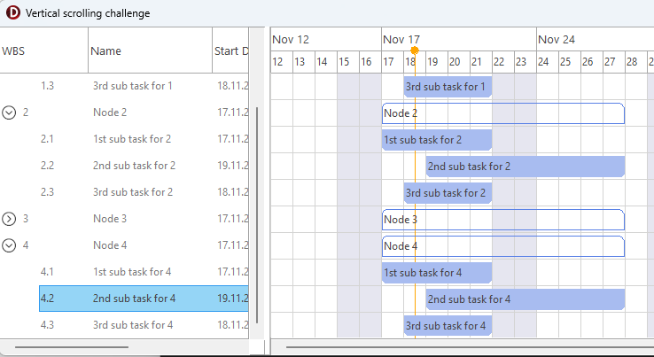 For example, if I click on entry 4.2, then close entry 3 and try to scroll up, synchronization is no longer correct or even temporarily blocked. Sometimes I cannot scroll back down to the bottom. The error usually occurs even faster when the horizontal scroll bar only appears in the timeline but not in the task list. Left and right sides mixed up. The only remedy, if any, is to close all nodes and reopen them. Is there a way to force synchronization here?