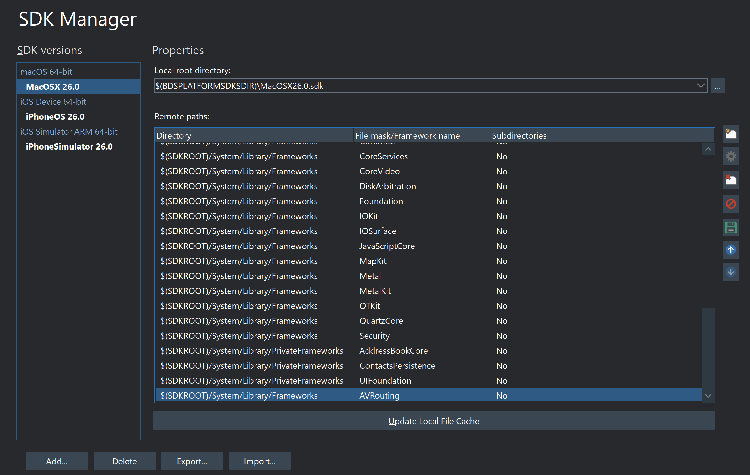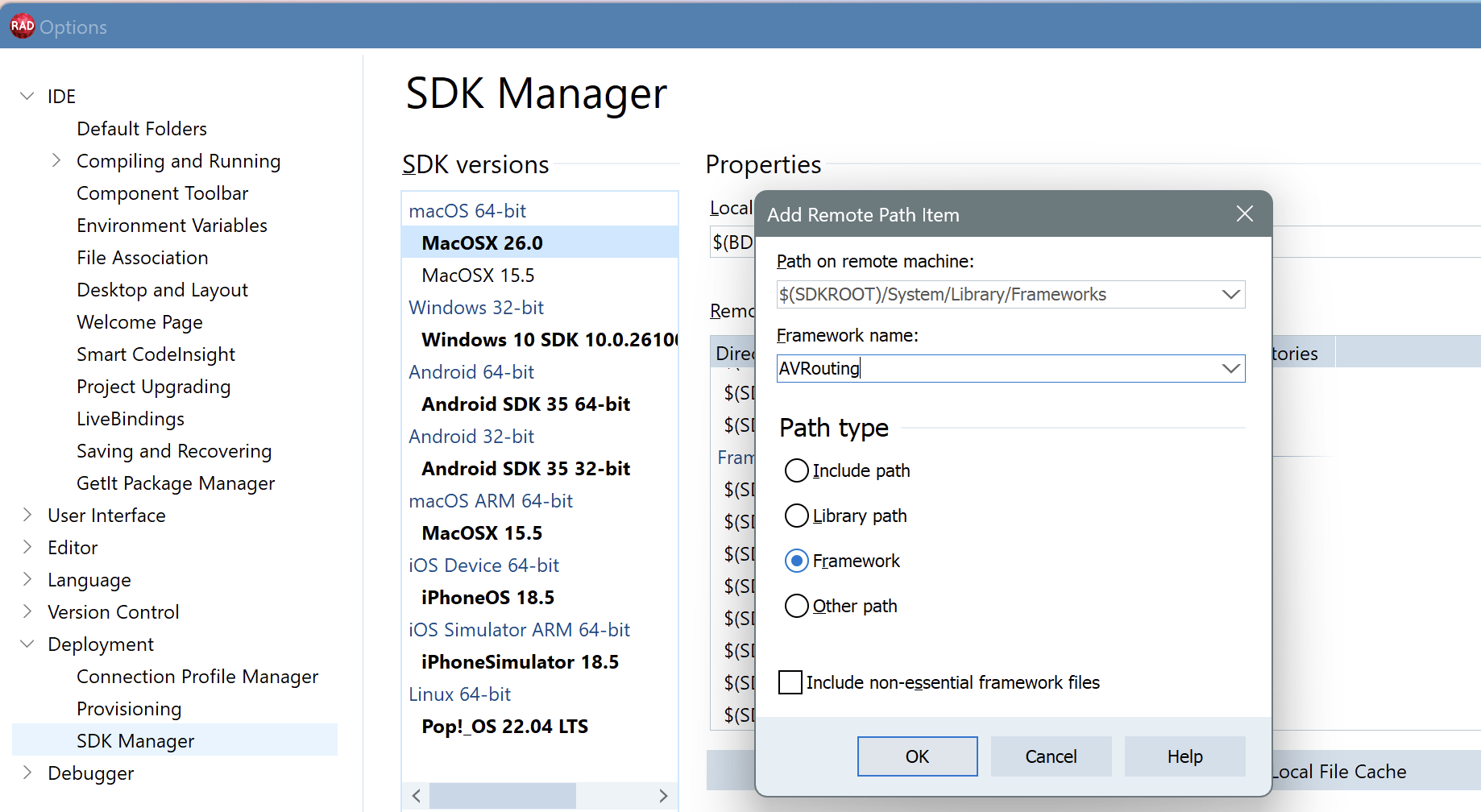 Adding AVRouting is needed for macOS26. This seems to be a new framework in macOS26, and Delphi 13 doesn't fetch it by default (maybe because Delphi 13 was released before macOS26), so you need to manually add it. This is something we will have to document, or convince embarcadero to fix.