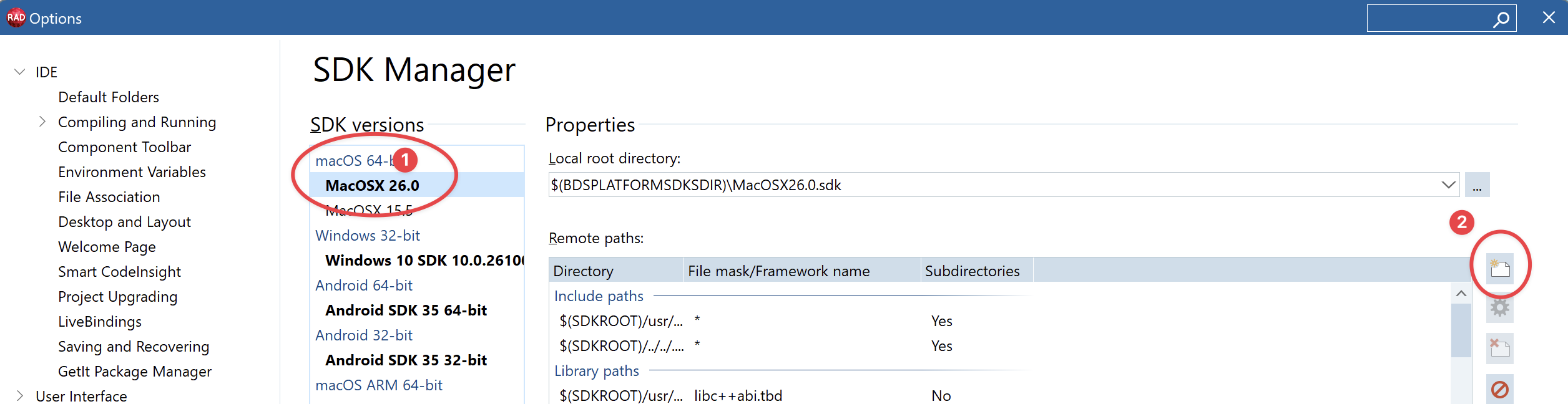 There, select the macOS 26 sdk (1) and press the "Add new path item" (2):