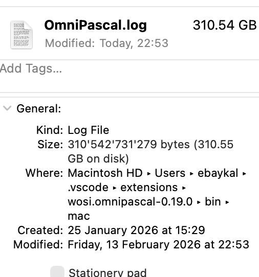 The OmniPascal extension has been logging continuously, has grown to 310.54 GB on Mac mini M4 pro, see the png file. TMS WEB Core VS version: 2.7.2198. How to disable it? I have manually delete the log file and recovered 310 GB disk space.