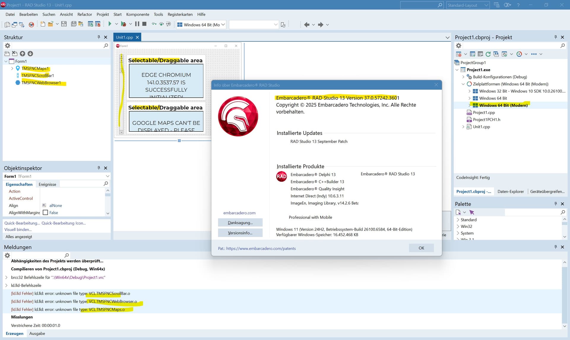 FNC Maps/Core is unusable with C++/VCL/Windows 64-Bit (Modern) which seems to be a problem of the FNC-packages (installation is automatic - I can not influence it in any way).