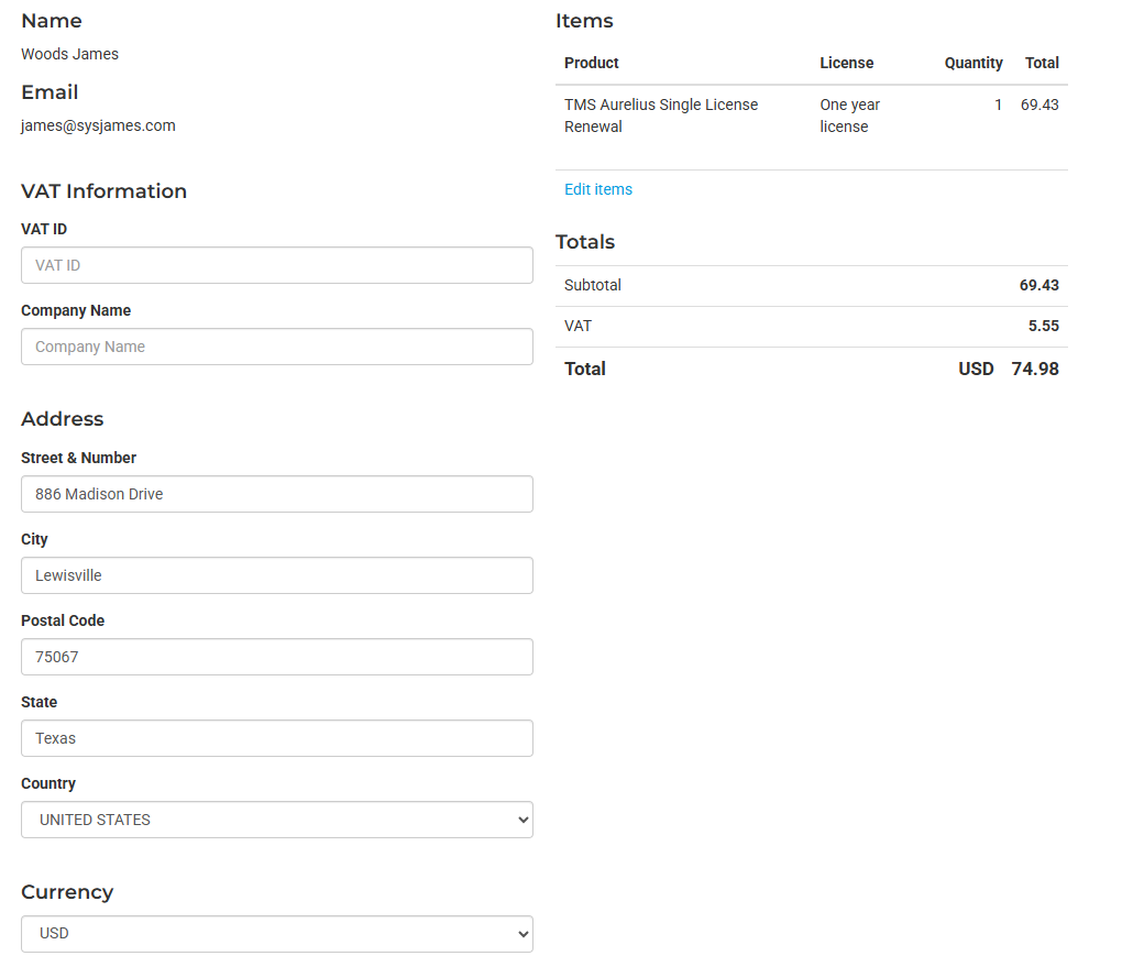 I got the offer to renew my two licenses but I requires I enter a VAT ID, which I don't have. I fill out all the information, set it to USD, but it still show VAT charge. I click on "Go to payment" and nothing happens. How do I take advantage of this discount offer?