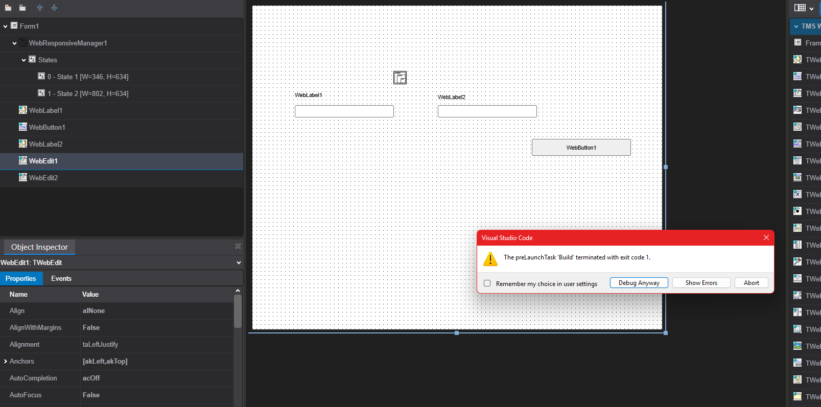 After closing and reopening the project, the TwebLabel, TwebEdit, and TwebButton components disappear from the form.