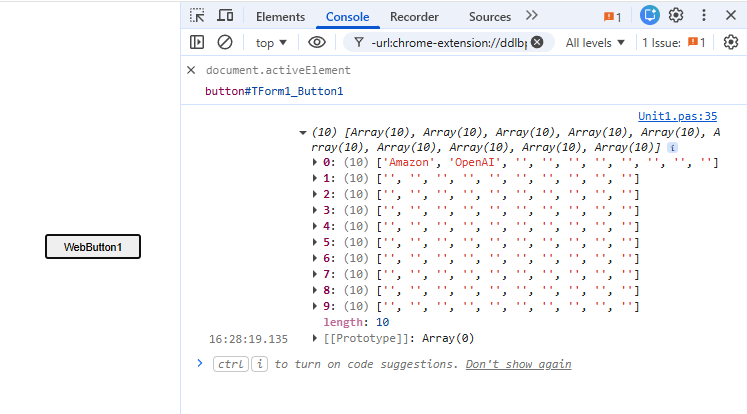 I've populated a TWeb ClientDataSet (cdsPI) with JSON data from an endpoint. Now I want to store the data in a dynamic two-dimensional array (arrDynPI). I'll define this array as either an array or an array or a string. Next I create the code snippet below: