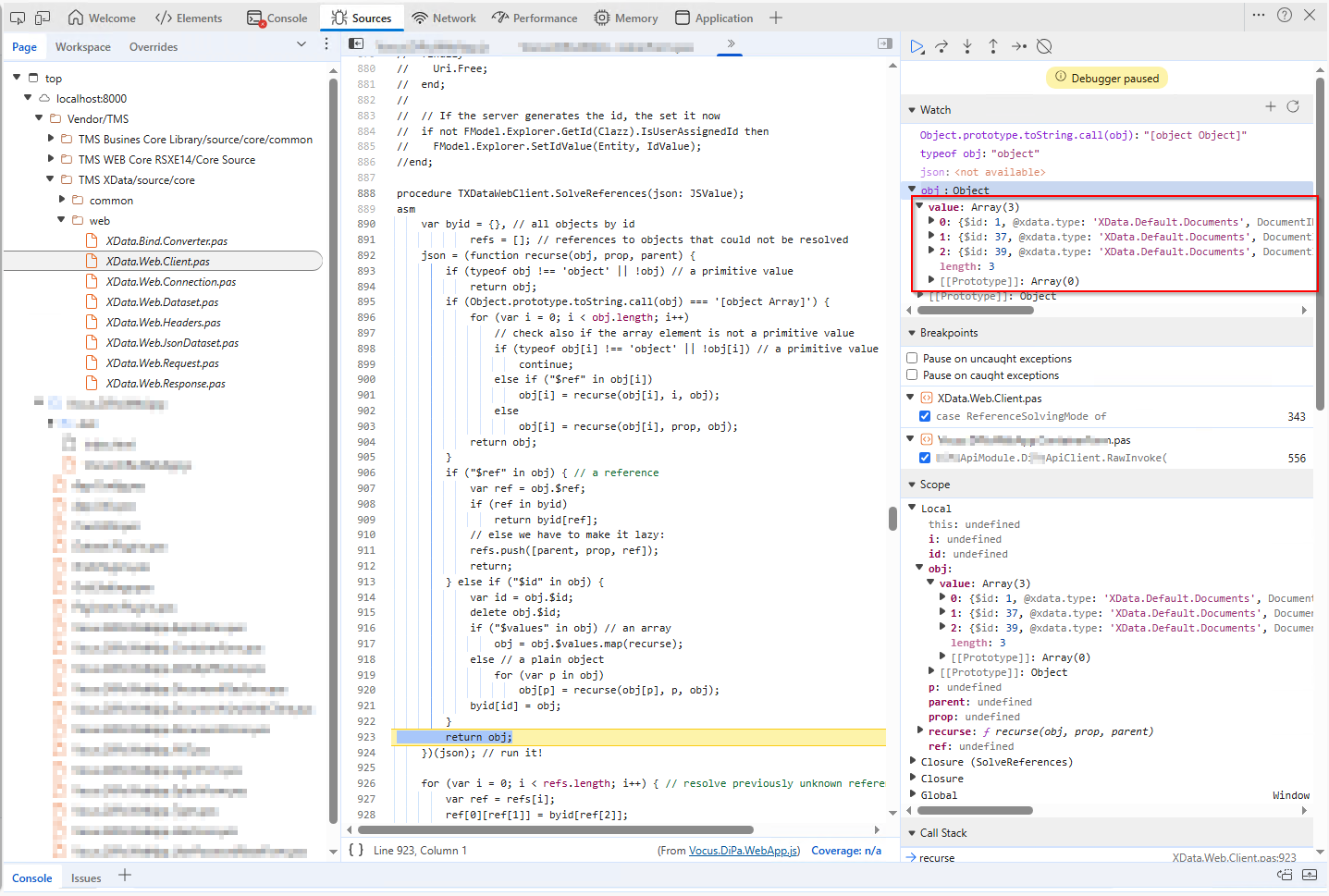I saw that there is a procedure called TXDataWebClient.SolveReferences(json: JSValue); that is supposed to solve the reference so I can get the object. When looking into it, I noticed that there is an if statement that checks if the object is an object Array. Inside this if statement, it solves the reference for each object inside the array.