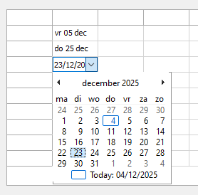 Thank you - I'll check it out and get back to you. But I'm using other editors in other columns (TCheckBox, TEdit, TComboBox etc.), so a "defaulteditor" is not appropriate, I think. And the "Value" assignment in GetDIsplText is also the one that is used (in my tests) when the DateEditor is being displayed (leading to "Thu 04 Dec 2025 is not a valid Date Specifier" (or something along those lines) when it is passed on to StrToDate at some point).