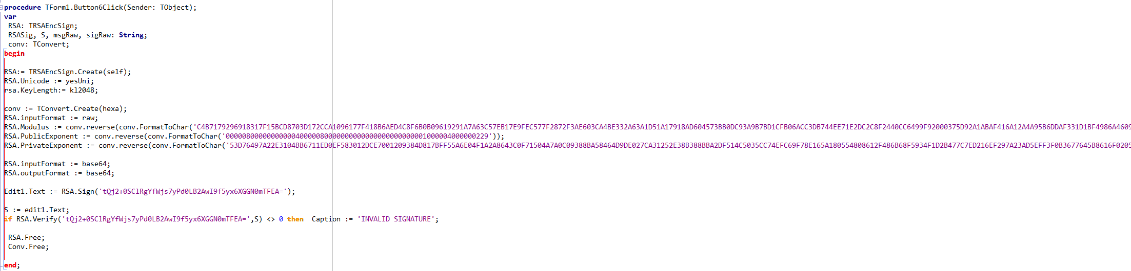if RSA.Verify('tQj2+0SClRgYfWjs7yPd0LB2AwI9f5yx6XGGN0mTFEA=', Edit1.Text) <> 0 then Caption := 'INVALID SIGNATURE';