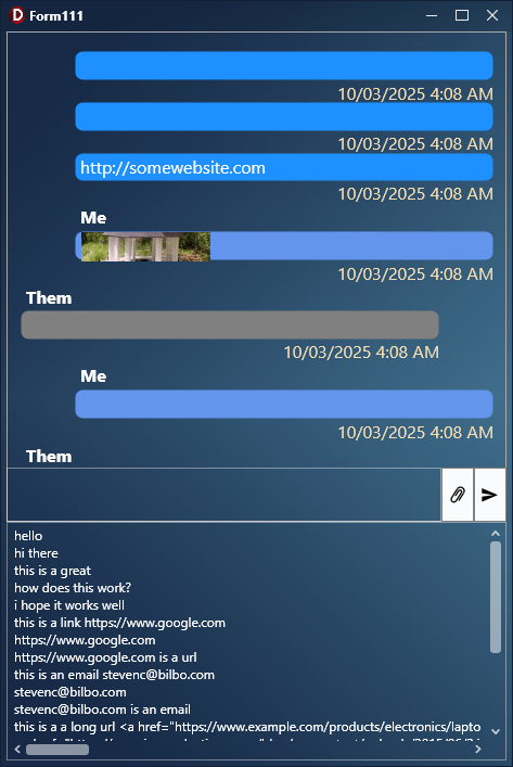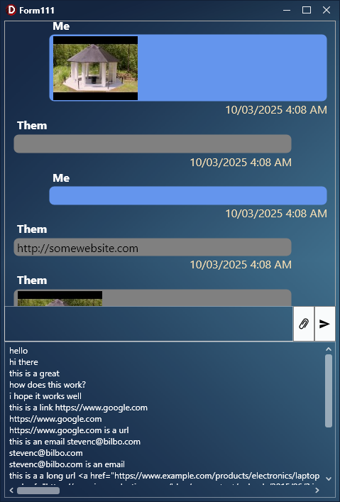 But.. option wise, I'd like to try and get it to pick up on URLs that have common file extensions, and show a thumbnail image for each image URL in a messag.. and click on it and show a full size image. Assume via some events to do so? Make it like a modern chat app where it auto coverts the img url into thumb nails.