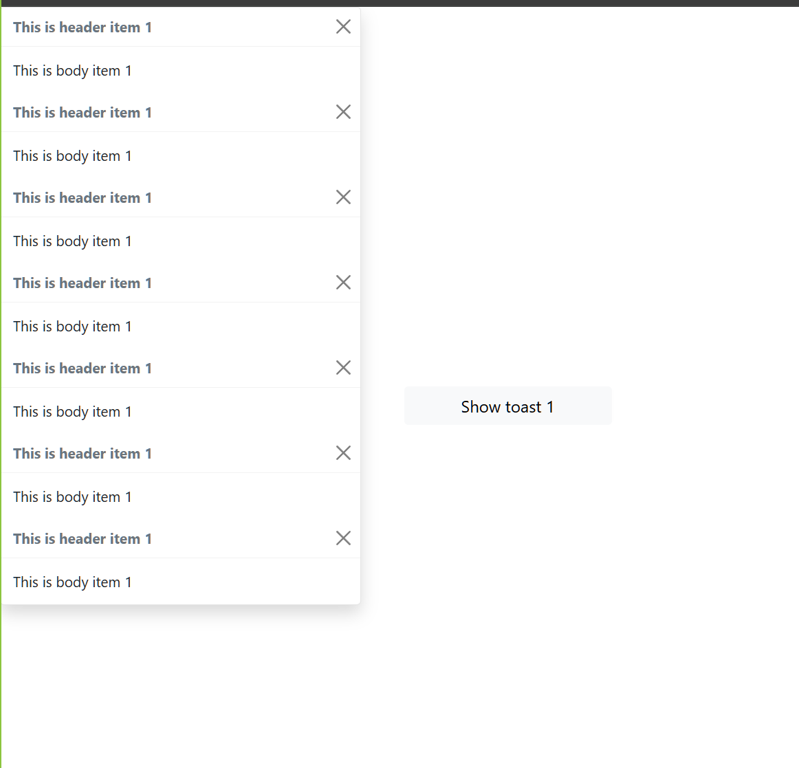 The AutoDelete=False for deffined toast item ... when you click on the button "Show toast 1" and waiting for the hide ... and if you click again ... we have two toasts with the same content, the same for the next clicks. Should be use the same toast.item[0] ... why do they multiply?